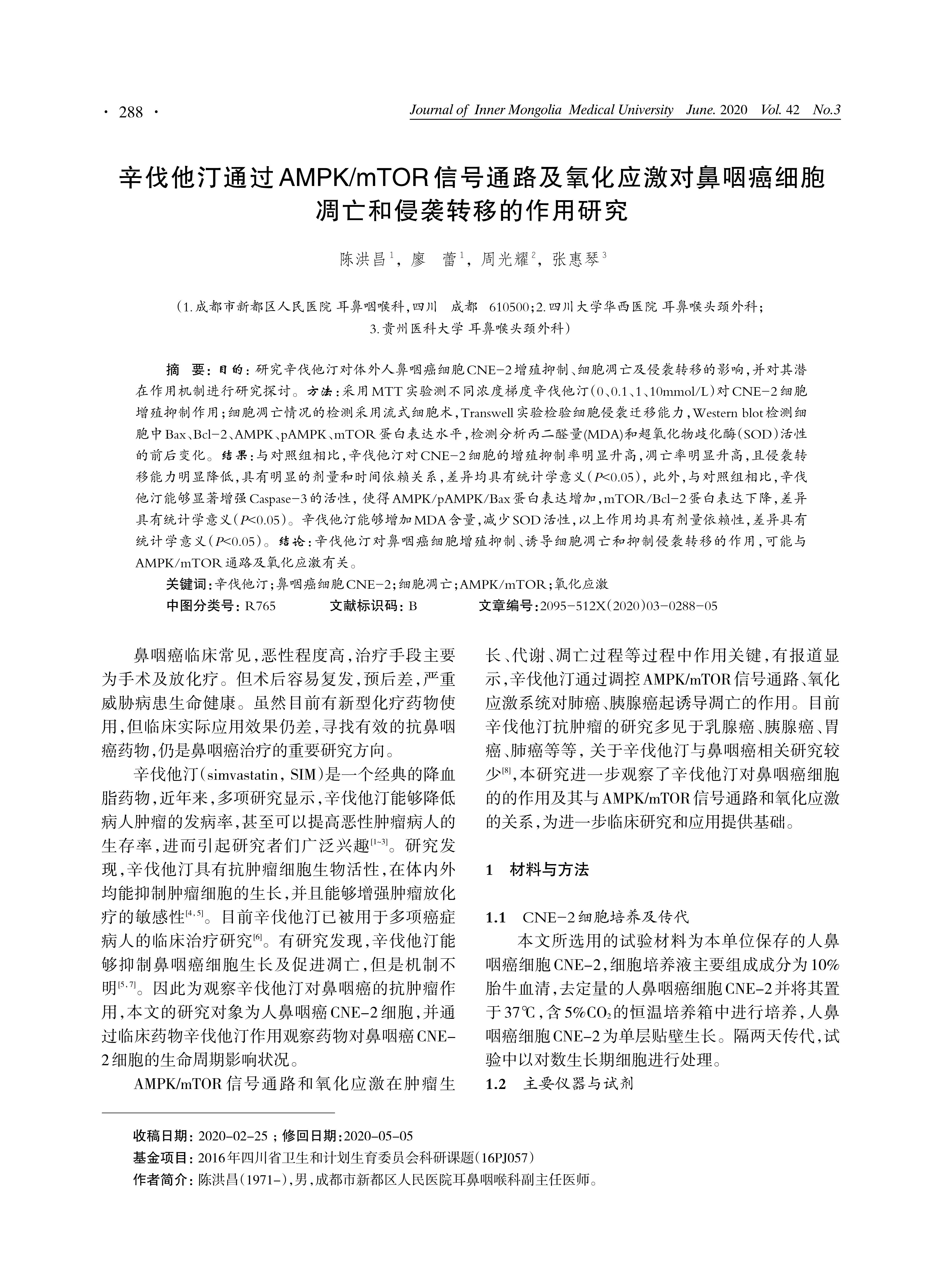 Objective To investigate the effects of simvastatin on cell proliferation, apoptosis, migration and invasion in nasopharyngeal carcinoma cells CNE-2 and its mechanisms. Methods MTT analysis was used to measure the inhibitory effect of simvastatin with different doses (0, 0.1, 1 and 10.0mmol/L) on CNE-2 cells. Flow cytometry was performed to analyze cell cycle andScell apoptosis. Transwell experiment was used to detect the cell migration and invasion. Western Blot was used to evaluate the expressions of Bax, Bcl-2, AMPK, pAMPK and mTOR. The level of malondialdehyde (MDA) and the activity of superoxide dismutase (SOD) in the CNE-2 cells were also examined.Results The inhibitory rate and apoptosis rate of simvastatin on CNE-2 nasopharyngeal carcinoma cells were higher than that in control group (P<0.05)Sand the cell proliferation inhibitionSrate and apoptosis rate showed a dose-andStime-dependent manner. The cell migration and invasion ability was decreased significantly in the simvastatin group(P<0.05). Compared with the control group, the activity of Caspase-3 in CNE-2 cells was increased significantly, and the expression levels of AMPK, pAMPK and Bax were increased significantly while the expression of mTOR and Bcl-2 were decreased significantly (P<0.05). The content rations of MDA increased significantly (P < 0.05) , and SOD decreased (P<0.05) by simvastatin. All the aboveSeffects of simvastatin were dose-dependent and the differencesSwere statistically significant (P<0.05). Conclusions Simvastatin may inhibit nasopharyngeal carcinoma cell proliferation, migration, and invasion and promote its apoptosis,and the effects may related with AMPK/mTOR signaling pathways and oxidative stress.