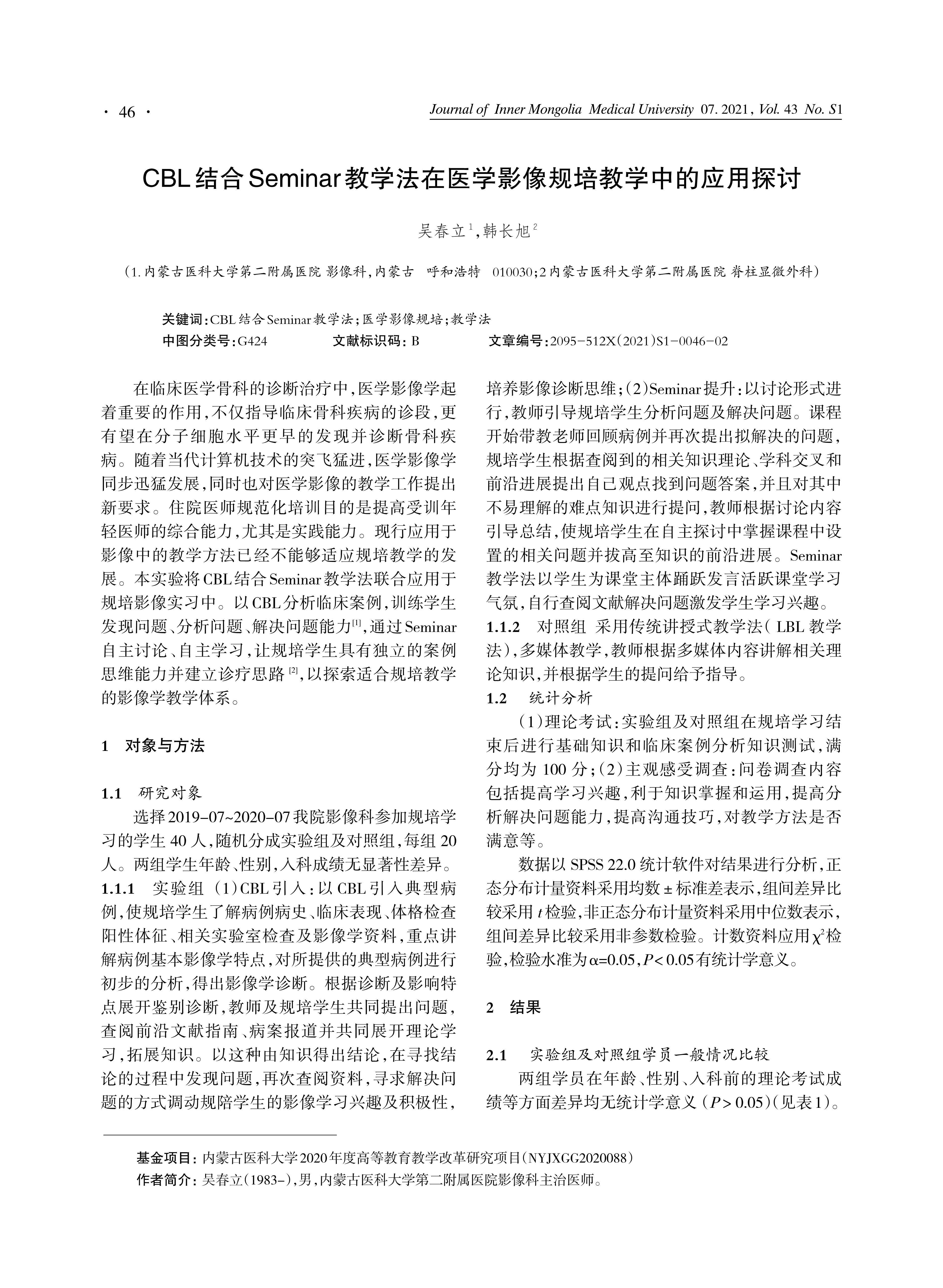 目的:探索探讨CBL结合Seminar教学法在医学影像规培教学中的应用价值,为我院推广CBL结合Seminar教学法提供经验。方法: 选择内蒙古医科大学2019-2020级影像规培医学生为研究对象,实验组采用CBL结合Seminar教学法,对照组采用传统讲授式教学法( LBL 教学法)进行影像规培教学,并进行理论考核,问卷调查主观感受。结果:实验组影像基础知识、影像图像分析、分析问题解决问题能力等明显优于对照组,具有统计学意义。结论:CBL结合Seminar教学法在医学影像规培教学中应用效果良好,能够提高规培学生的考核成绩、学习积极性、主动性及学习能力。