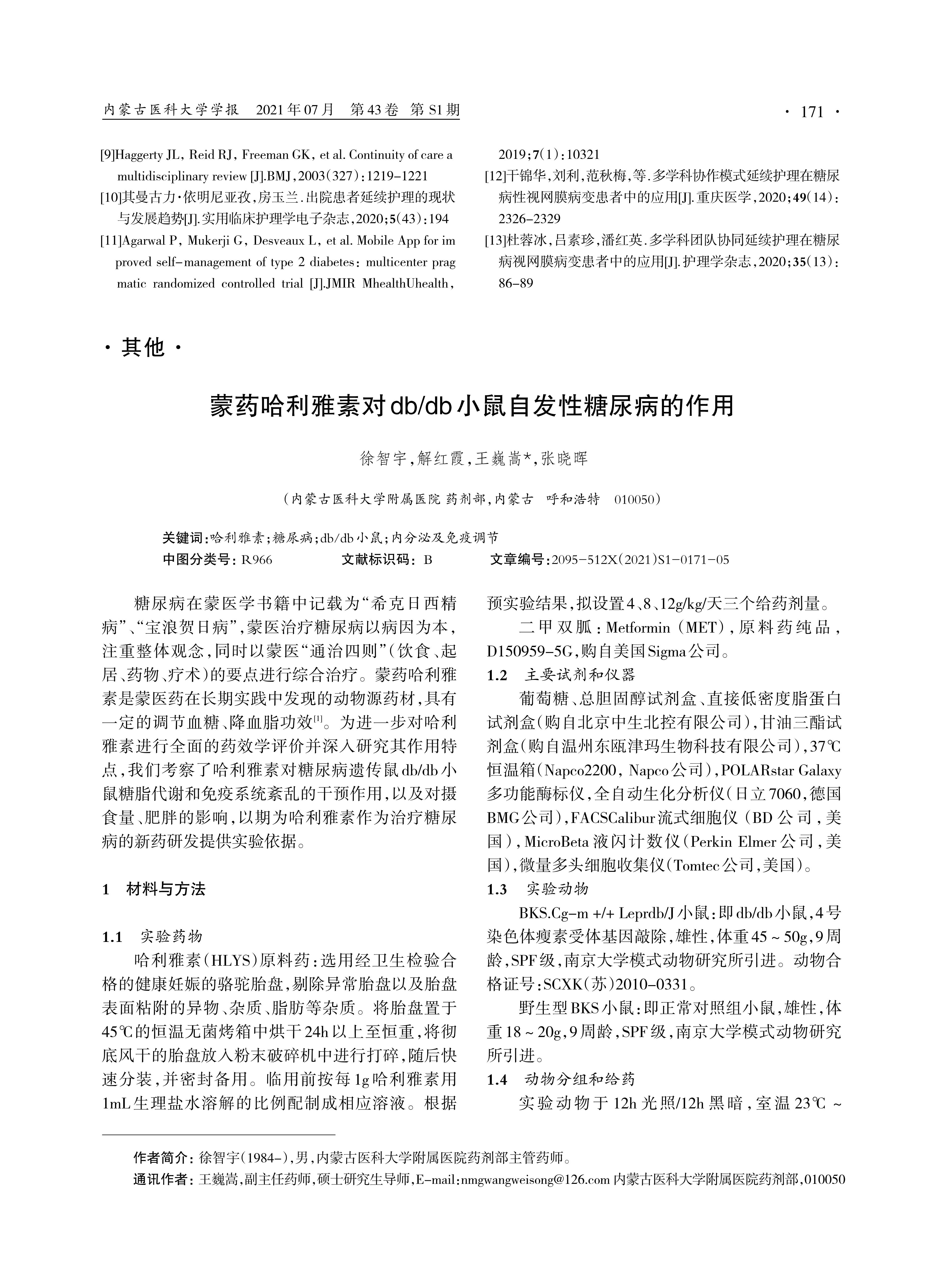 目的 哈利雅素是动物源蒙药材,本研究利用db/db自发性糖尿病小鼠探讨了哈利雅素治疗糖尿病的作用特点。方法 动态监测哈利雅素连续给药8周对db/db自发性糖尿病小鼠摄食量、空腹血糖(fasting blood glucose, FBG)、总胆固醇(total cholesterol, TC)、甘油三酯(Triglyceride, TG)、低密度脂蛋白胆固醇(low density lipoprotein-cholesterol, LDL-C)水平的影响,实验结束后称取内脏脂肪重量(visceral fat mass, VFM)并计算内脏脂肪系数(visceral fat coefficient%, VFC%),最后进行免疫系统研究。结果 哈利雅素可降低db/db小鼠的摄食量和VFC%,改善腹型肥胖;持续稳定的降低FBG、TG、TC、LDL-C等糖脂代谢水平同时增强细胞免疫和体液免疫能力。结论 哈利雅素具有改善食欲和腹型肥胖并显著降低血糖、血脂水平的作用,且对内分泌和免疫功能紊乱具有调节和改善作用,具有作为治疗糖尿病新药的研究开发的前景。