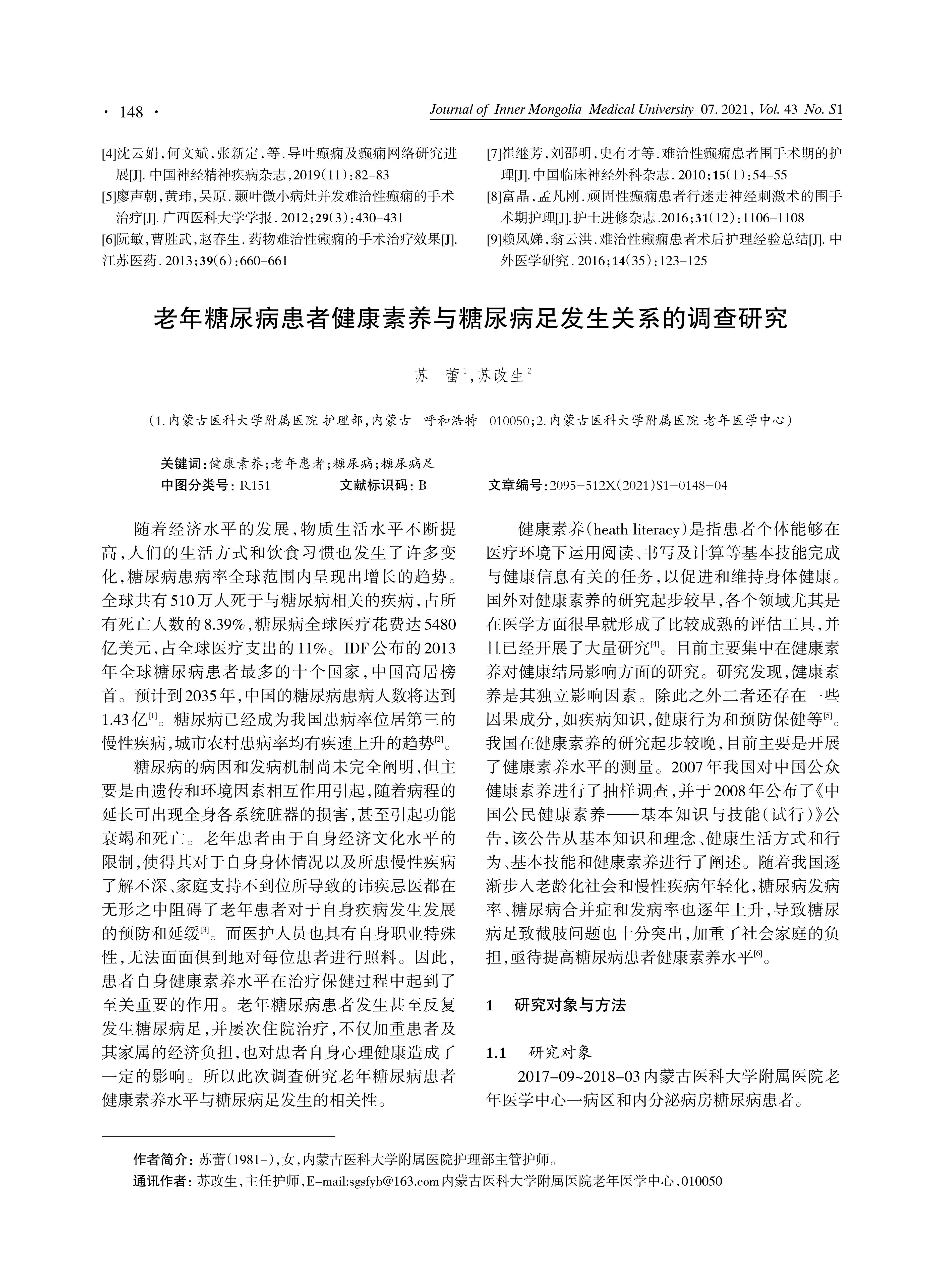 Nursing Department of Inner Mongolia Medical University Hohhot District 1 of Geriatric Center 010059 Abstract: Objective: In order to explore the relationship between health literacy and diabetic foot in elderly diabetic patients. Methods: The elderly diabetes patients were selected from the District 1 of Geriatric Center department and the department of endocrinology of Inner Mongolia Medicai University from September 2017 to March 2018 .The patients were investigated and studied in the from of questionnaire on the health literacy of diabetic foot.The survey tools include the general information questionnaire of patients and the Chinese version of the Nottingham foot nursing assessment scal, and the data are analyzed by SPSS17.0 software .The statistical methods incuded normality test, variance homogeneity test, statistical description logistics regression analysis and so on. Results: The level of heath literacy and the incidence of diabetic foot in elderly diatetic patients were statistically significant (P<.05). Conclusion:Improving the health literacy of eldely diabetic patients can help prevent or delay the occurrence and development of diabetic foot. Key words: eath literacy;elderly patients; diabetic mellitus; diabetes foot