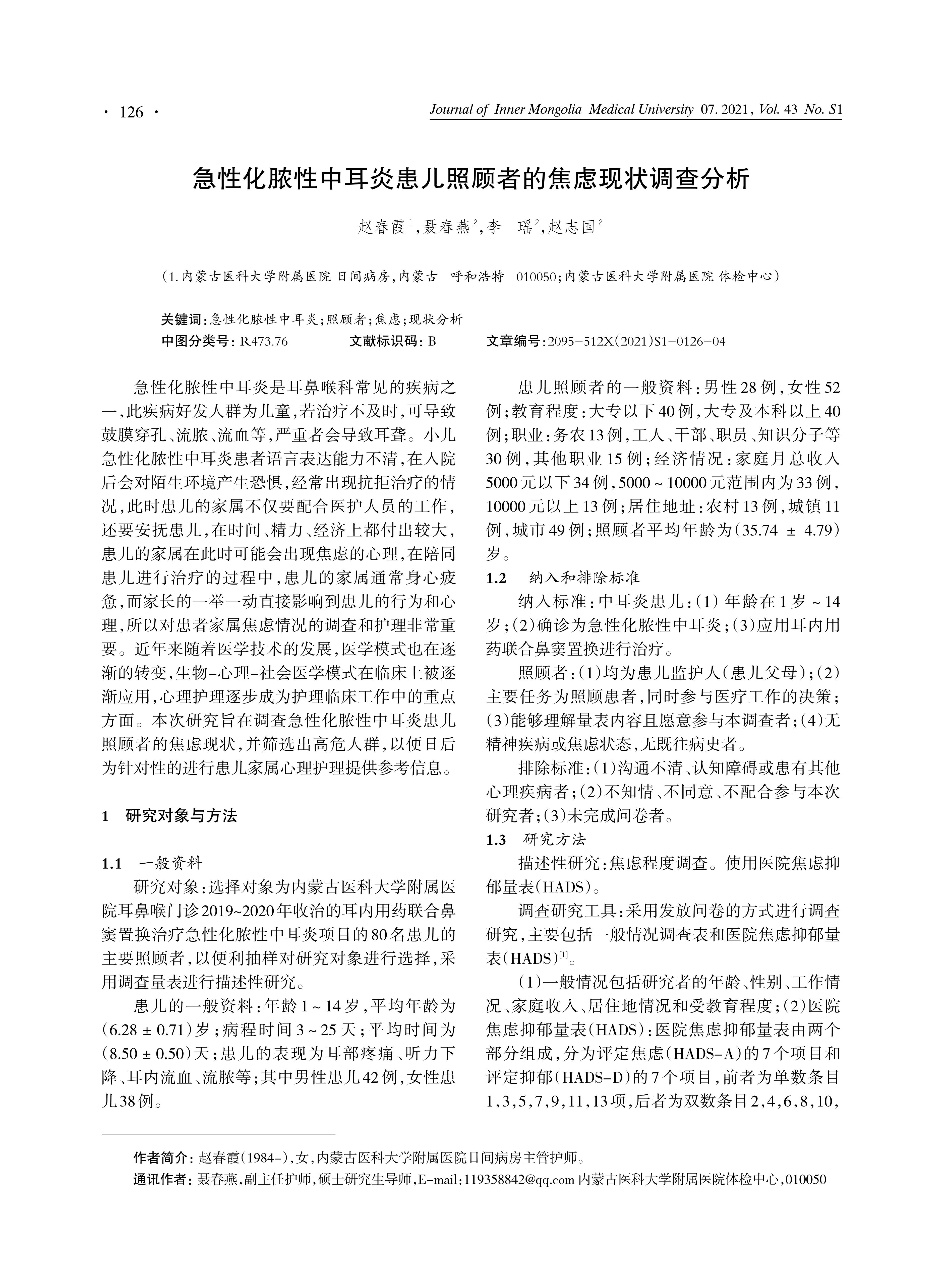 目的:调查急性化脓性中耳炎患儿照顾者的焦虑现状,并对此进行分析。方法:选择对象为内蒙古医科大学附属医院2019-2020年收治的耳内用药联合鼻窦置换治疗急性化脓性中耳炎项目的80名患儿的主要照顾者,以抽样研究方式对研究者进行选择,采用调查量表进行描述性研究,比较不同因素对焦虑的影响。结果:急性化脓性中耳炎患儿的照顾者较易出现焦虑情况,焦虑与性别、年龄无明显关系,其中居住地P值小于0.001,职业P值为0.011,教育程度P值为0.007,月收入P值为0.044,说明患儿照顾者的焦虑程度与教育程度、职业、居住地、月收入相关。结论:在治疗急性化脓性中耳炎患儿的过程中,应根据照顾者的情况进行针对性护理,建立良好的医患关系,提高治疗和护理质量。