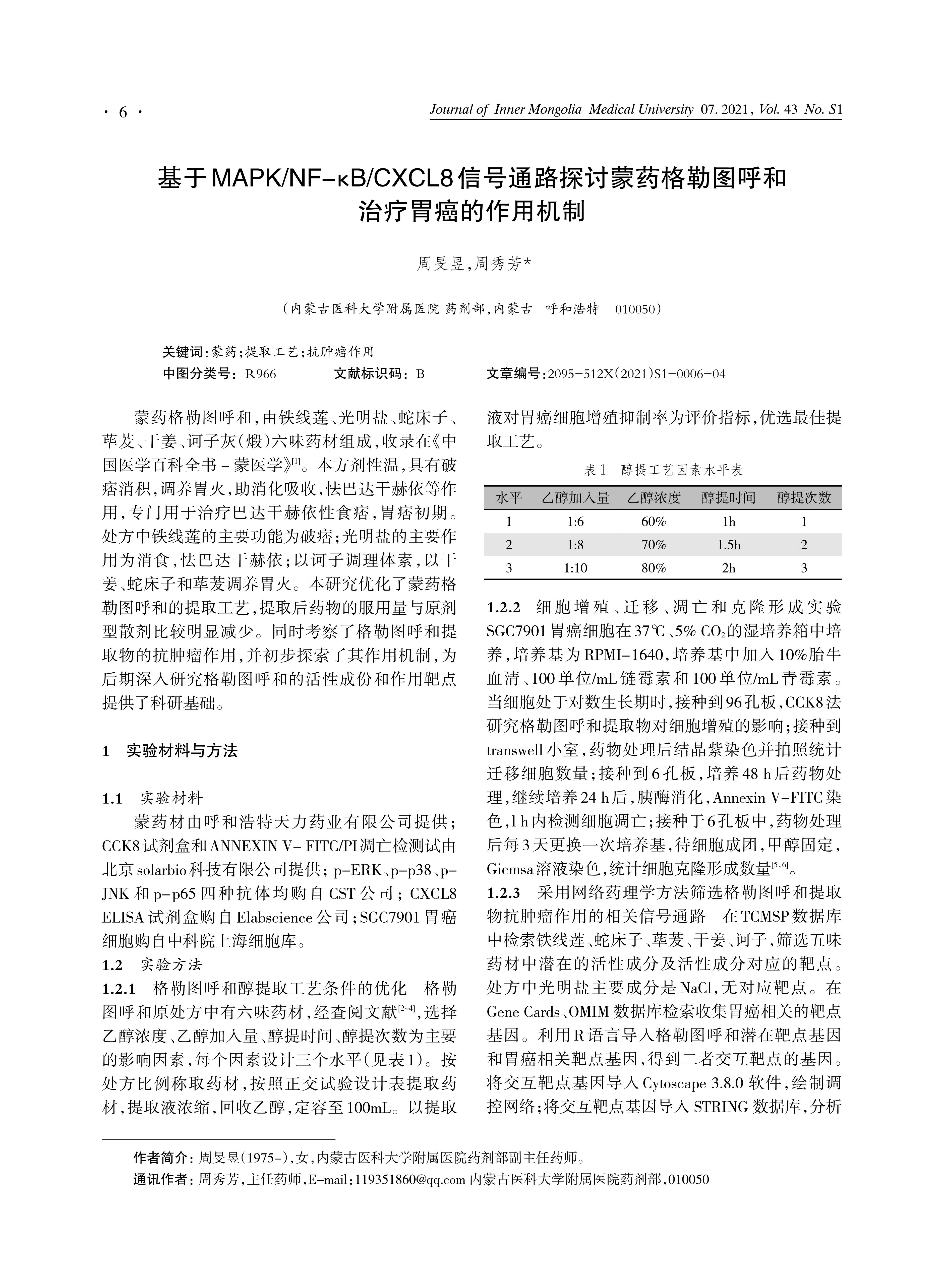 []目的 研究蒙药格勒图呼和治疗胃癌的作用机制。方法 采用正交试验设计法筛选蒙药格勒图呼和的最佳提取工艺;采用体外细胞实验考察格勒图呼和提取物对胃癌细胞增殖迁移、凋亡以及克隆形成的影响;采用网络药理学分析和western blot验证相结合的方法研究格勒图呼和提取物治疗胃癌的信号通路。结果 格勒图呼和的最佳提取工艺为加入8倍量70%的乙醇提取1小时,连续提取2次;格勒图呼和提取物能够抑制胃癌细胞增殖、迁移和克隆形成,促进胃癌细胞凋亡,且具有剂量依赖性;格勒图呼和提取物能够抑制胃癌细胞中JNK、p38、ERK和p65的磷酸化,降低CXCL8的分泌。结论 格勒图呼和提取物通过MAPK/NF-κB/CXCL8信号通路发挥抗肿瘤作用,作为治疗胃癌的民族药值得深入研究。