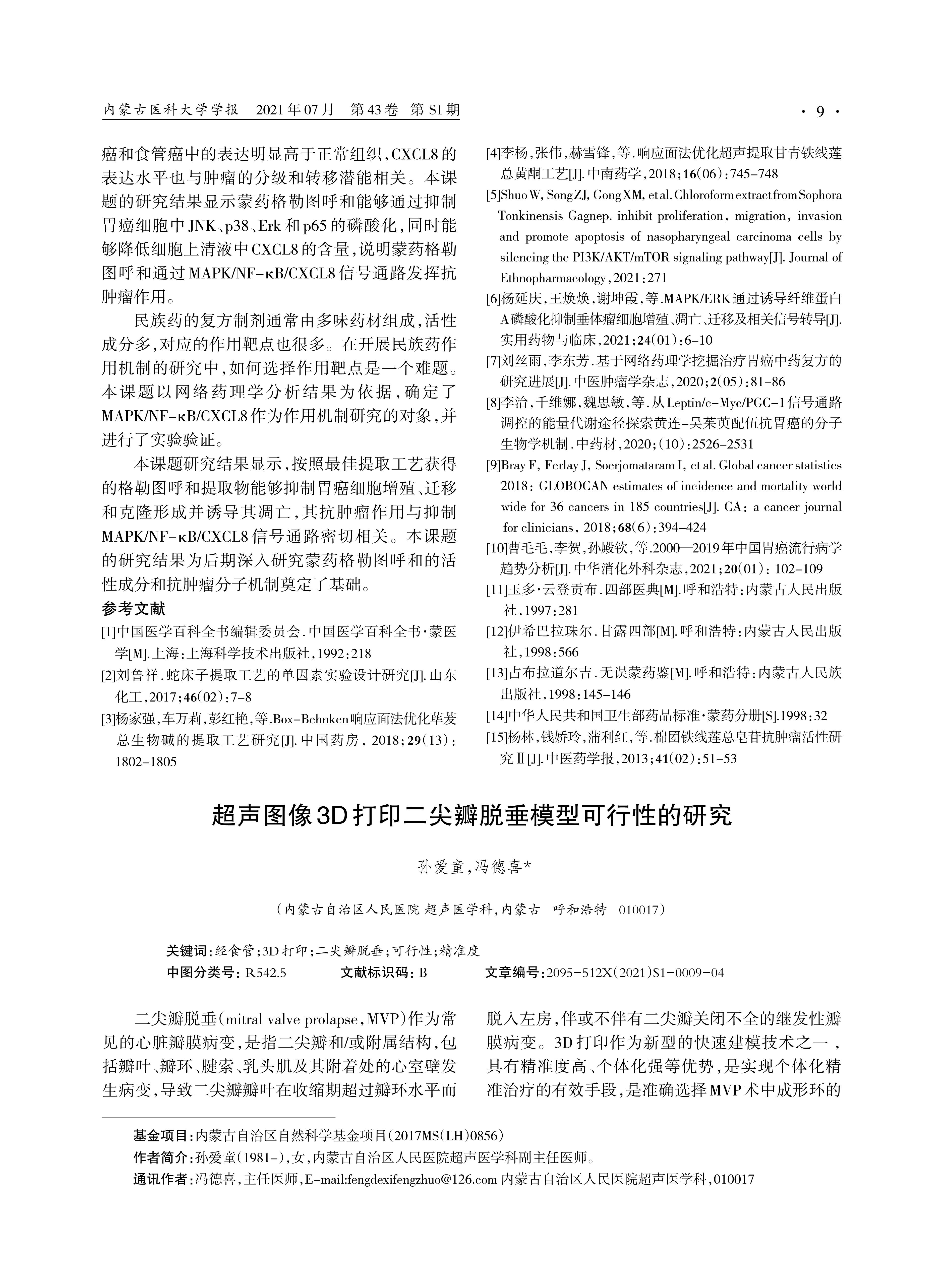 [摘要] 目的探讨 3D 打印技术制作二尖瓣脱垂模型的应用价值 方法 回顾性分析单纯二尖瓣脱垂患者20例,术前行三维经食道超声心动图检查,以Mimics软件对 3D-TEE图像进行后处理,得到二尖瓣脱垂容积图像STL格式文件,输出文件并打印二尖瓣脱垂模型。对3D模型和3D-TEE图像分别测量以下三维周长、前后直径、瓣环前外侧至后内侧直径、高度、瓣环高度与前外侧至后内侧直径的比率 、脱垂高度。 计算 3D 模型各参数值与 3D-TEE 图像中各参数值的绝对差值。 结果 20例患者均成功进行二尖瓣脱垂三维建模并打印出3D模型;3D模型中的二尖瓣环各参数值与 3D-TEE 图像中的各参数值相比,差异均无统计学意义 ( P>0.05),所有测值均有较好的一致性。结论 3D-TEE 图像数据可作为二尖瓣脱垂3D 建模及打印的数据来源,基于超声技术 3D打印二尖瓣脱垂模型精准度较高。