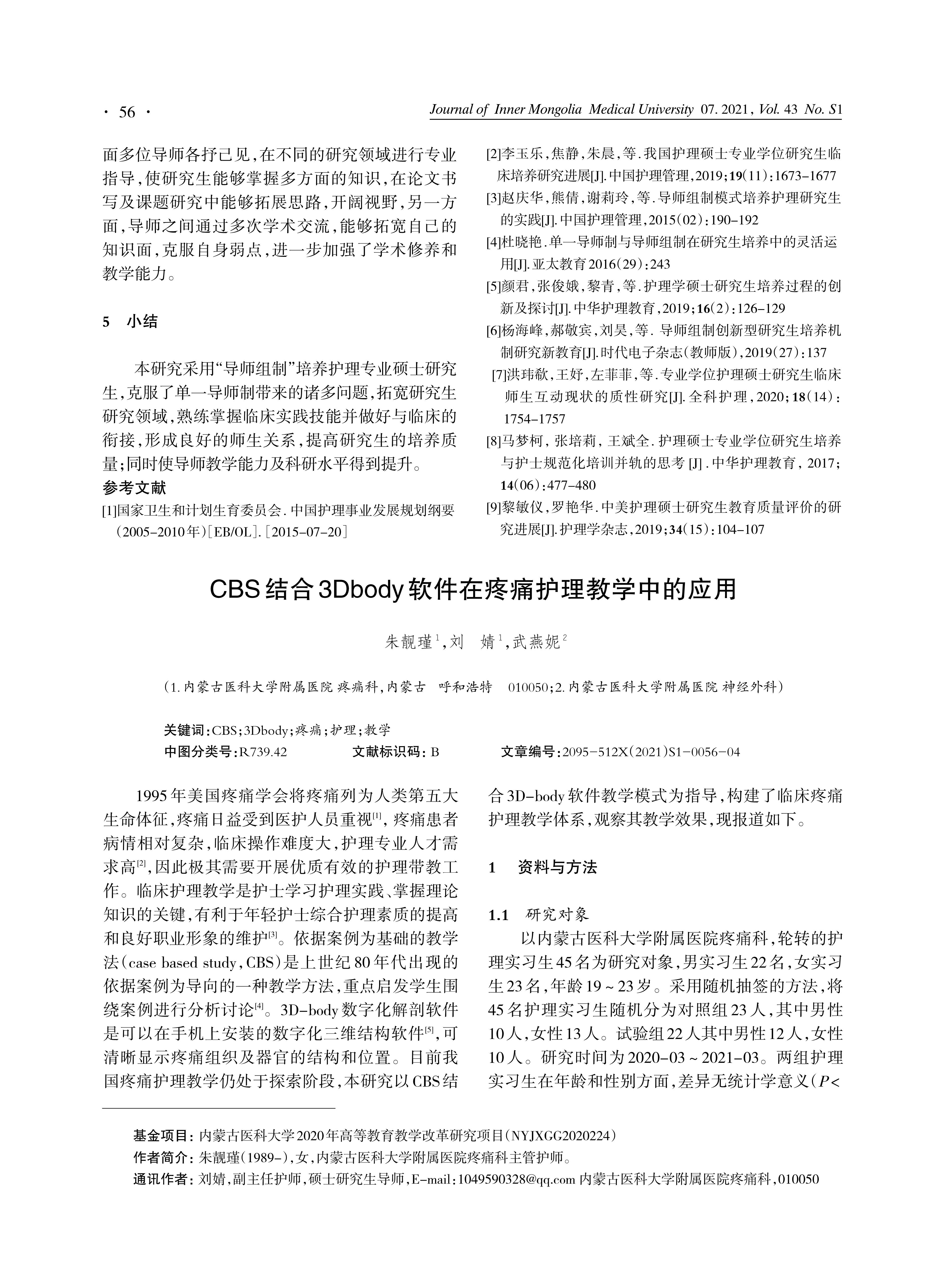 Objective To explore the application value and feasibility of CBS combined with 3dbody software in pain nursing teaching. Methods 45 nursing interns in the Department of pain from 2020 to 2022 were selected and randomly divided into the control group and the experimental group; the control group (23 students) used the traditional teaching method, and the experimental group (22 students) used the traditional teaching method CBS combined with 3dbody software teaching method, compared the two groups of interns' examination results, teaching effect and interns' satisfaction with the teaching mode. Results The theoretical knowledge examination results of the experimental group were better than those of the control group ,the difference between the two groups was statistically significant(p<0.05); the learning efficiency, learning interest, active interaction willingness, knowledge acceptance, communication and expression ability of the experimental group were better than those of the control group ,the difference between the two groups was statistically significant(p<0.05); the satisfaction of the experimental group was higher than that of the control group,the difference between the two groups was statistically significant(p<0.05); Conclusion The experimental group has a higher level of theoretical knowledge than the control group CBS combined with 3dbody software in pain nursing teaching can effectively improve the learning enthusiasm and initiative of nursing interns, significantly enhance the teaching effect of nursing interns' practice course, and has high clinical application value.
