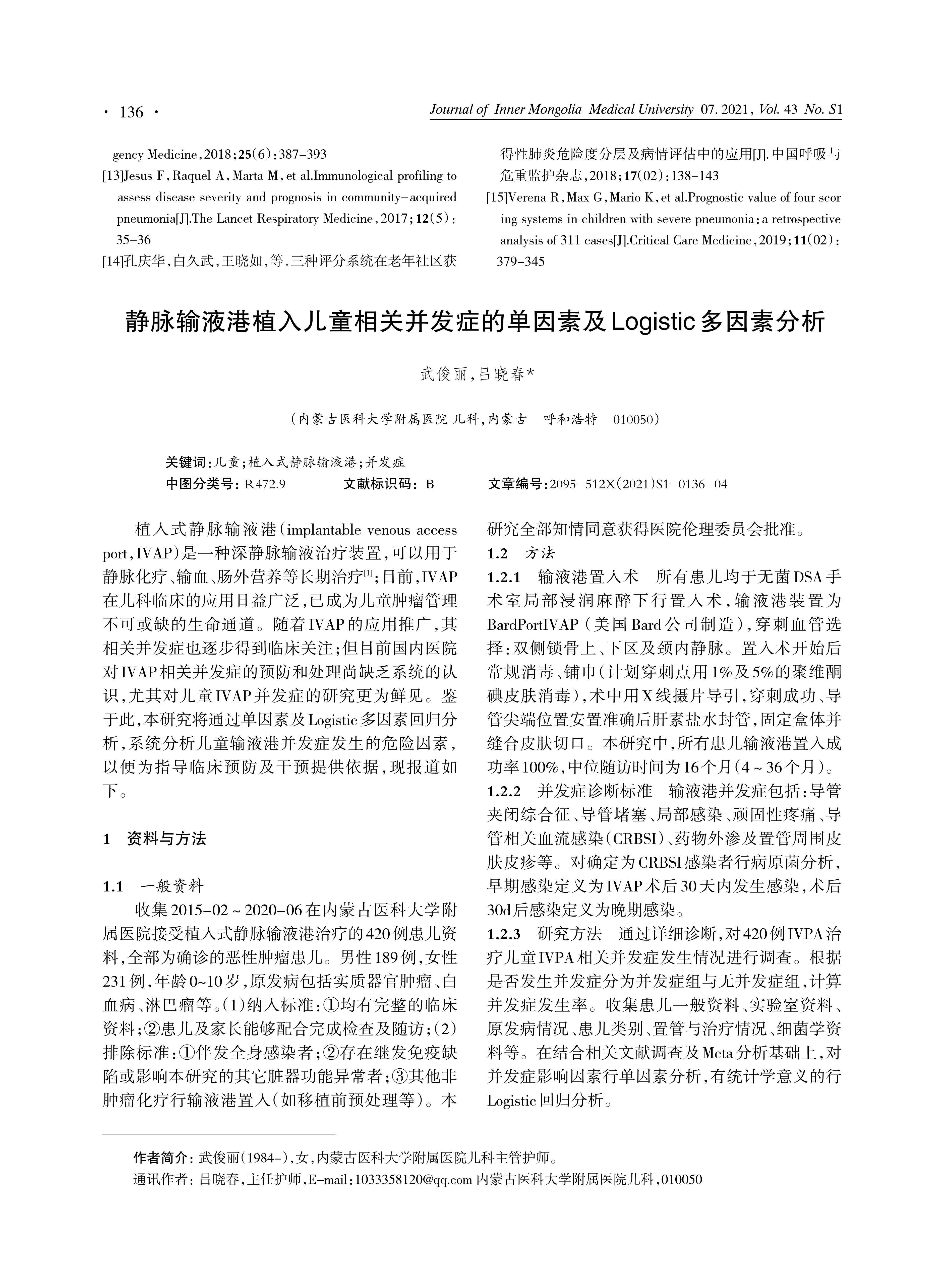 [摘要]:目的 探讨儿童植入式静脉输液港(IVPA)应用中并发症发生的危险因素,为儿科临床防控IVPA常见并发症提供理论依据。方法 收集2015年2月至2019年6月在内蒙古医科大学附属医院接受植入式静脉输液港治疗的420例患儿资料,根据是否发生IVPA相关并发症分为并发症组与无并发症组,采用单因素及多因素logistic回归方法分析IVPA并发症事件及其危险因素。结果 纳入本研究的IVPA治疗儿童置入术后共有33例出现并发症,发生率为7.86%(33/420),其中局部感染最常见,占2.86%(12/420);单因素分析中,并发症组与无并发症组患儿在年龄、肿瘤类型、是否为住院患儿及血白蛋白水平等差异均有统计学意义(t/x2=4.652、7.256、5.303、6.093,P<0.05);运用多因素回归分析,结果显示恶性血液系统肿瘤(OR=5.976,P<0.05)、血白蛋白水平低(OR=3.027,P<0.05)是导致儿童IVPA植入术并发症发生的独立危险因素(均P<0.05)。结论 恶性血液系统肿瘤、血白蛋白水平低、低幼儿童以及住院患儿可能与儿童植入式静脉输液港治疗中更高的并发症发生率有关,根据影响因素强化早期管理和合理治疗,可以有效提升IVPA治疗安全性、降低相关并发症发生。