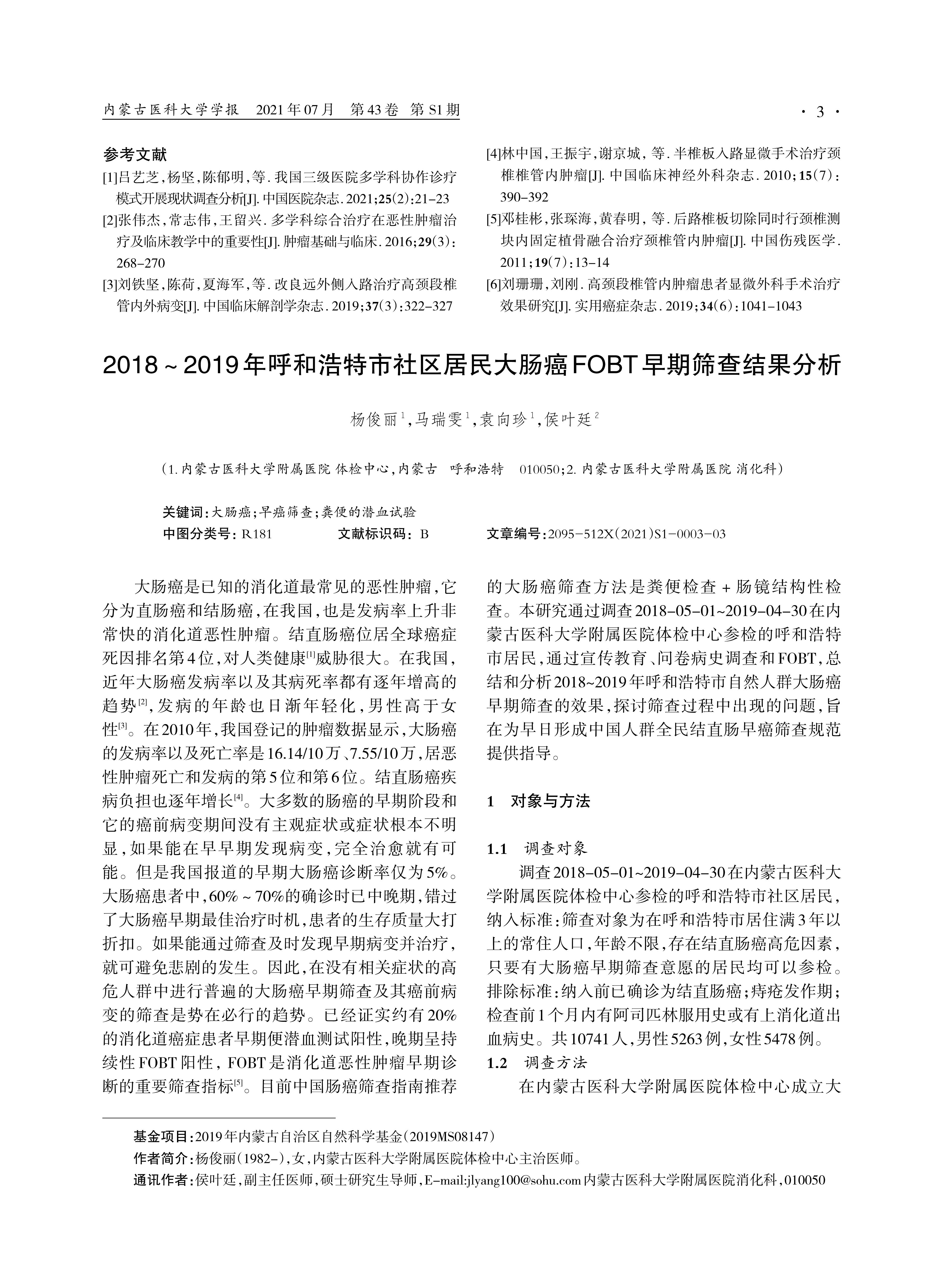 目的:总结和分析2018-2019年呼和浩特市自然人群大肠癌早期筛查的效果,探讨筛查过程中出现的问题,为推动社区早癌筛查工作提供指导。方法:调查2018年5月1日-2019年4月30日在内蒙古医科大学附属医院体检中心参检的呼和浩特市居民,通过宣传教育、问卷病史调查和数值化免疫定量粪便潜血试验(fecal occult blood tests,FOBT)检测开展大肠癌筛查。结果:共完成初筛10741人,男5263例,女5478例,年龄18-87岁。FOBT检查结果阳性559例,初筛完成率为 99%,初筛阳性率为5.2%。高危人群中肠镜检查阳性率为14.67%,大肠癌检出率为0.89%。总大肠癌检出率为46.55/10万。结论:FOBT对早期发现和诊断大肠癌及其癌前病变具有重大意义,普及中国体检人群大肠癌早期筛查是健康中国的重要步骤。