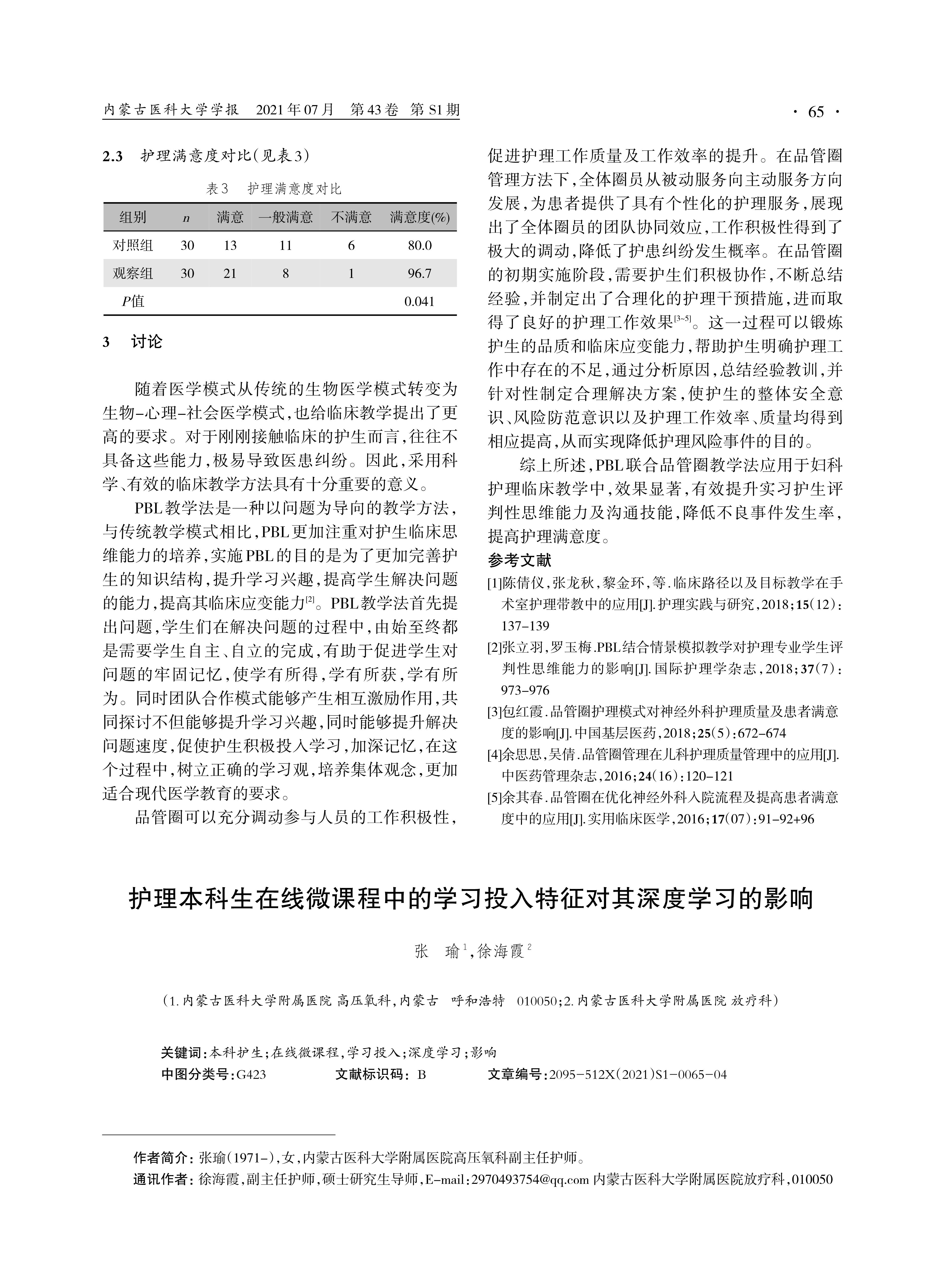 目的 研究护理本科生在线微课程中的学习投入特征对其深度学习的影响,为护理在线教学建设提供帮助。方法 采用方便抽样法将内蒙古医科大学已开展在线微课程教学的80名护理本科生纳入研究,采用学习投入特征量表、网络深度学习量表等研究工具进行调查,分析在线微课程学习期间护生的学习投入、网络深度学习等指标的相关性。结果 本次研究中,本科护生在线微课程学习期间学习投入量表总分为(46.70±6.98)分,网络深度学习量表总分为(49.20±5.39)分,Pearson相关分析显示,本科护生在线微课程学习期间学习投入对其网络深度学习有正向预测作用(r=0.267,P<0.01)。结论 护理本科生在线微课程中的学习投入特征对其深度学习的影响具有显著价值,在当前网络时代背景在线学习开展的趋势下,医学院校护理管理者和教育者应重视对本科护生的学习投入引导,从而有益于其网络深度学习能力及绩效的改善。